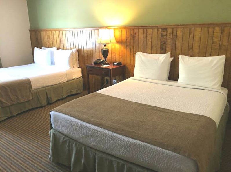 Each Queen room at Bass' Hancock House Hotel boasts 2 super comfortable Queen sized beds. You won't have to call the front desk for more pillows or another blanket. You'll find 4 substantial pillows right on your bed when you check in. In the closet, right next to the iron and ironing board, you'll find a full length heavy blanket. You'll also be able to relax in an overstuffed arm chair right next to the writing desk. We believe good service is anticipating your needs.